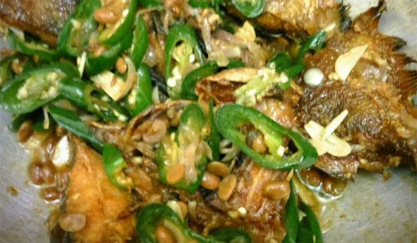 - Tumis bawang bombay, bawang putih, cabe hijau dan jahe hingga harum. Masukkan ikan. Tambahkan tauco, kecap manis, belimbing wuluh, salam, serai dan air.