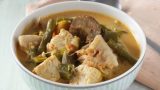 • Masukkan daun singkong, tahu, tempe dan beras kacang tumbuk. Aduk-aduk dan masak terus hingga kental.