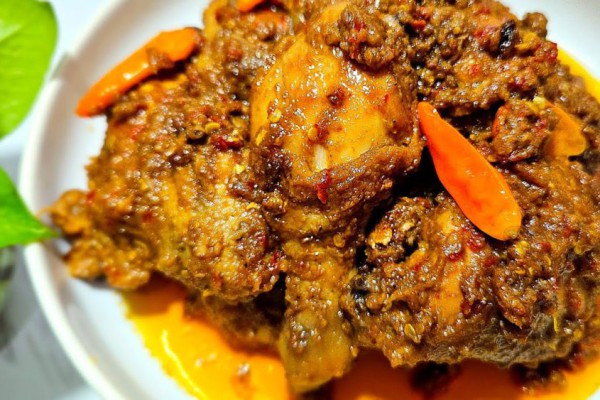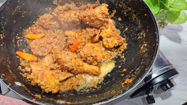 - Setelah aroma rempah siap dan matang, tambahkan santan, ayam, serta cabai rawit merah utuh ke dalamnya.