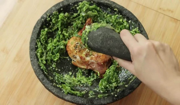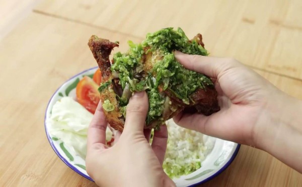 14. Setelah menggoreng, taruh ayam ke dalam cobek atau penghancur, kemudian beri topping sambal hijau diatasnya. Remas-remaskan ayam menggunakan ulek untuk memastikan bumbu menyerap dengan baik.