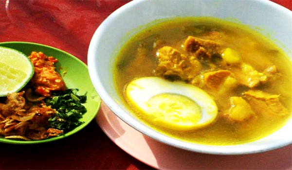 - Cara menghidangkan, taruh potongan daging, soun, tauge dan daun bawang di mangkuk. Tuangi dengan kaldu sapi. Beri potongan daun seledri dan bawang goreng. Beri pula perasan air jeruk nipis.